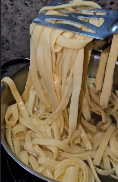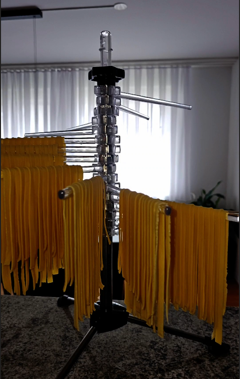 - Aufbewahrung vor dem Kochen: Die geschnittene Pasta entweder auf einem Pastaständer zum Trocknen aufhängen oder locker auf ein bemehltes Backblech legen, damit sie nicht zusammenklebt.