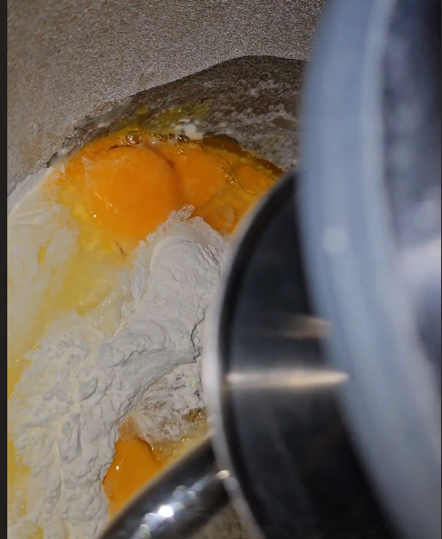 Mehl, Eier, Salz (und optional Olivenöl) in die Schüssel der Küchenmaschine geben