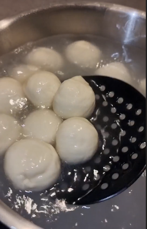 Jeweils 5–8 Brötchen für 15–20 Sekunden in die Lauge geben (wenden nicht vergessen), sie gehen dabei im Wasser noch etwas auf