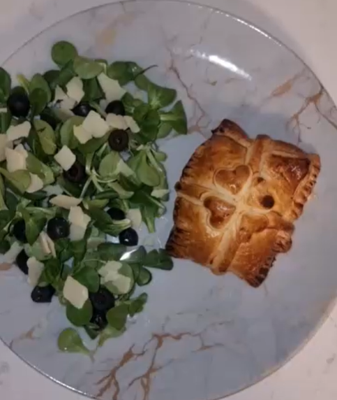 Am besten mit einem frischen gemischten Salat servieren, die Leichtigkeit des Salats passt perfekt zum herzhaften Blätterteig.