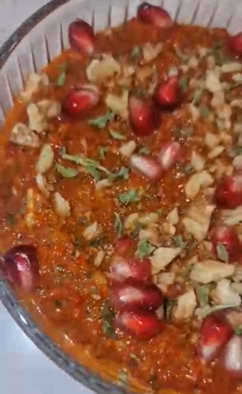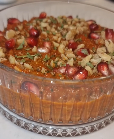 Muhammara ist ein cremiger Dip aus gerösteten Paprika, Walnüssen und orientalischen Gewürzen. Er überzeugt mit einer leicht rauchigen Note, fruchtiger Säure und einer feinen Schärfe, perfekt als Vorspeise mit Brot, als Beilage zu Fleisch oder als Teil einer Mezzeplatte.