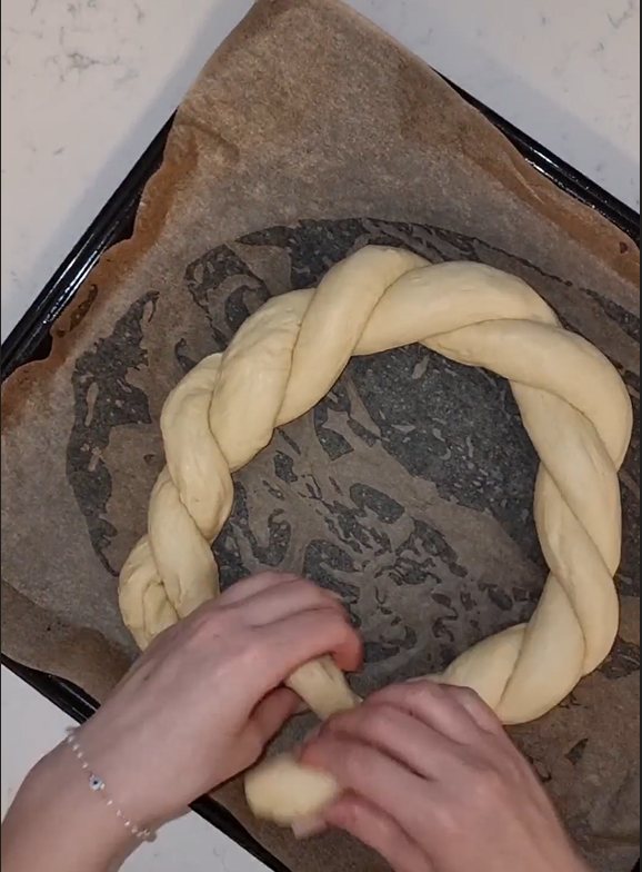 Stränge über das Backblech legen, zu einem Zopf flechten und dabei einen Kreis formen, Enden unter den Zopf stecken
