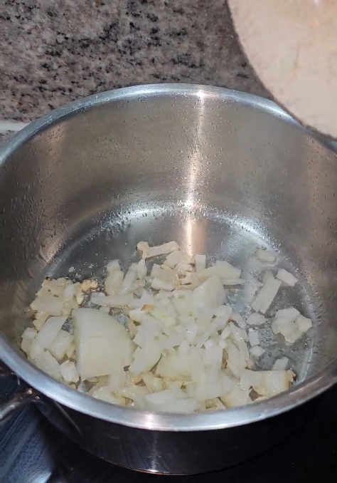 Zwiebel und Knoblauch fein hacken und in Olivenöl glasig dünsten