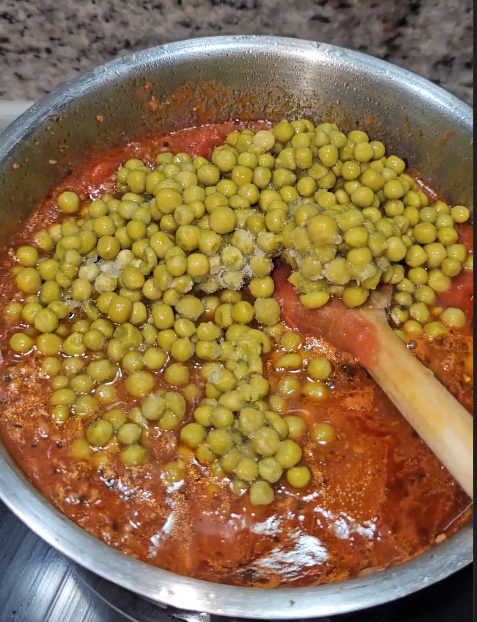 Erbsen in die Sauce geben und weitere 5 Minuten mitköcheln