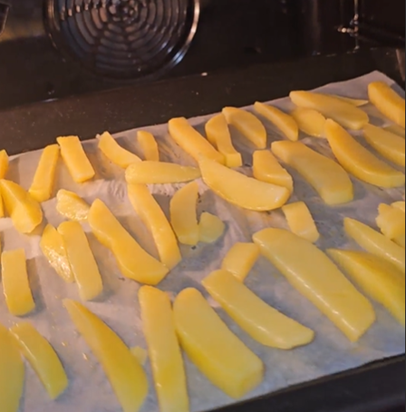 Auf ein mit Backpapier belegtes Blech geben und gleichmässig verteilen, die Pommes sollten sich nicht berühren