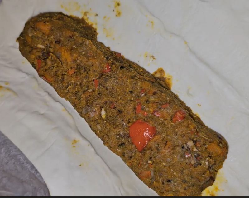 Blätterteig ausrollen und die Füllung zu einem kompakten Strang auf etwa ⅓ der Teigbreite verteilen (an den Enden etwas Rand frei lassen)