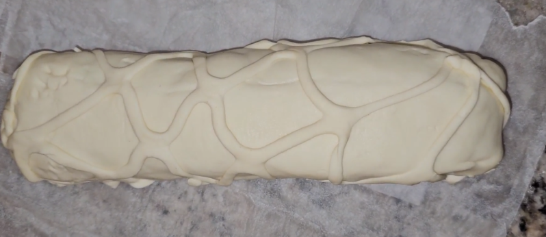 Mit der Rückseite eines Messers vorsichtig ein Rautenmuster einritzen oder aus Teigresten dekorative Formen ausstechen (z. B. mit Plätzchenformen oder einem speziellen Teigrädchen für Wellington) und auflegen
