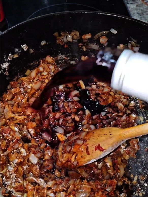 Tomatenpüree und Mehl dazugeben, kurz mitrösten