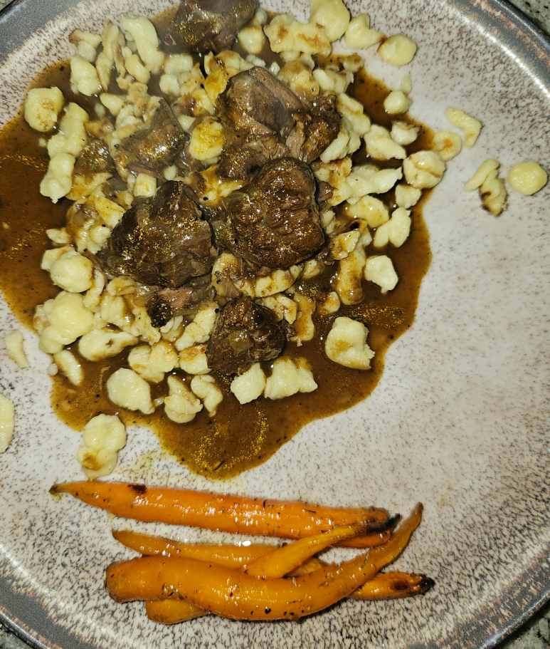 Zartes Rindfleisch, langsam geschmort in einer aromatischen Sauce aus Zwiebeln, Knoblauch und Rotwein – ein herzhafter Klassiker, der perfekt zu Kartoffelstock, Spätzli oder frischem Brot passt.