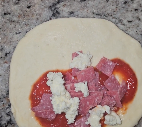 Eine Teighälfte mit Tomatensauce bestreichen, Füllung draufgeben, zu Taschen falten und Ränder gut andrücken z.B. mit einer Gabel