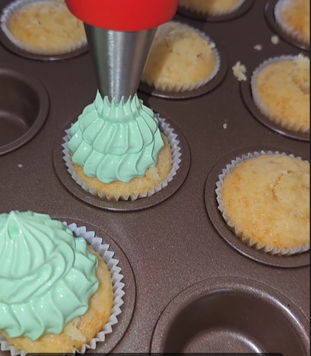 Baisermasse in einen Spritzbeutel mit fein gezackter Sterntülle füllen und dekorativ auf die Muffins spritzen