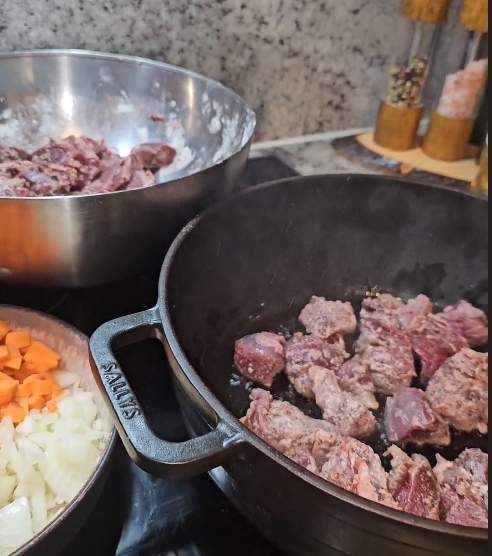 Fleisch zurück in den Topf geben, aufkochen und zugedeckt bei niedriger Hitze 1,5–2 Stunden schmoren, bis das Fleisch zart ist