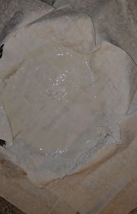 Zwei ganze Fillo-Blätter kreuzweise in die leicht geölte Form legen, sodass die Ränder über den Rand hängen