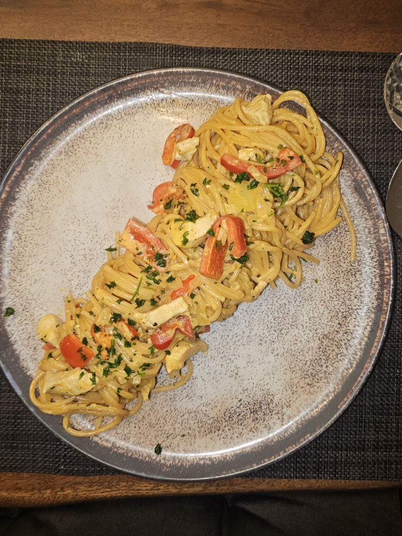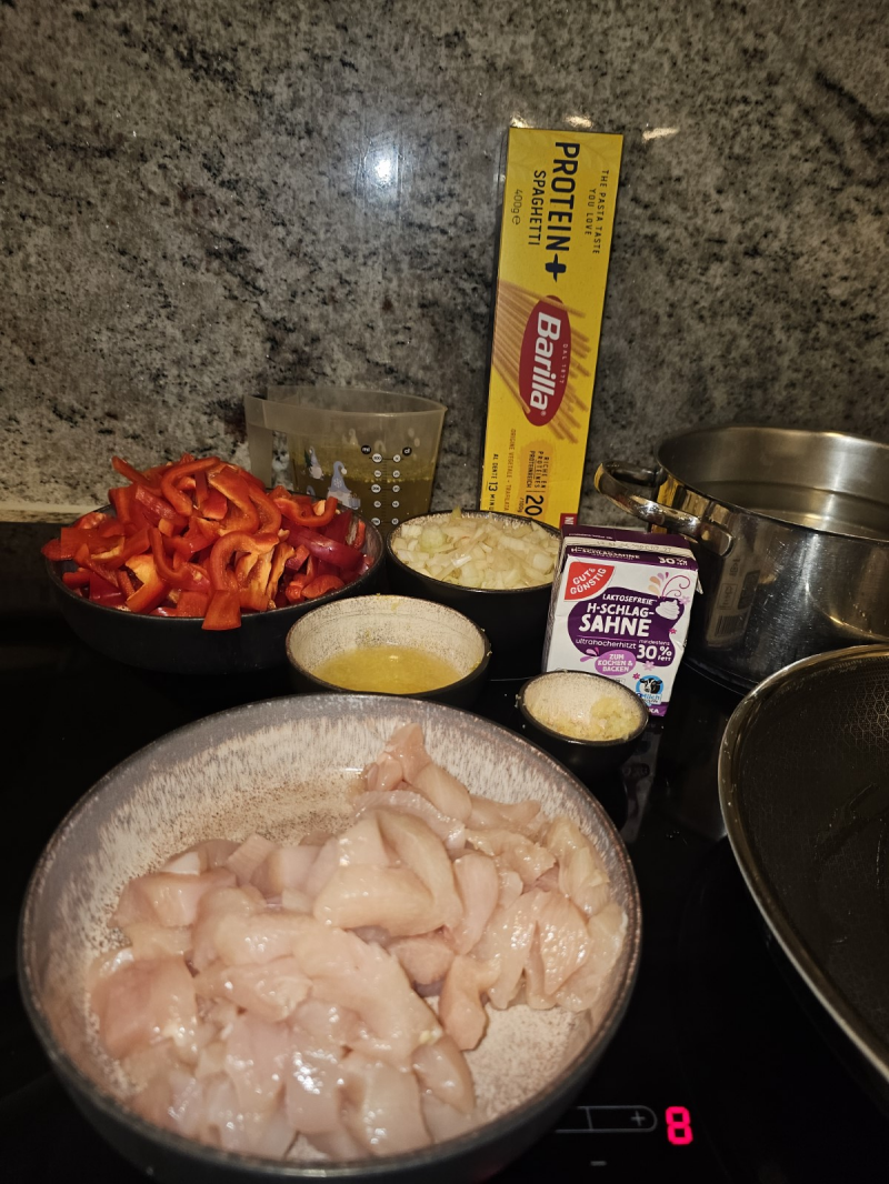 Ein leichtes, cremiges und proteinreiches Gericht – ideal für die Schwangerschaft, da eine gute Eiweisszufuhr wichtig für die Entwicklung deines Babys und deinen eigenen Energiehaushalt ist. Die Kombination aus zartem Hähnchen, einer frischen Paprika-Zitronensauce und Proteinpasta sorgt für eine ausgewogene, sättigende Mahlzeit.