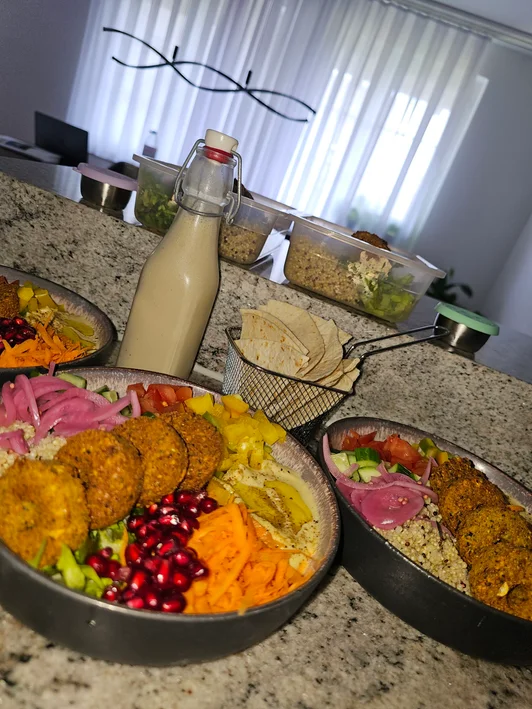 Ich gebe zusätzlich meist noch eine weitere Proteinquelle dazu, auch wenn bereits die Kichererbsen im Hummus und in den Falafel Proteine liefern. Gute Ergänzungen sind zum Beispiel: