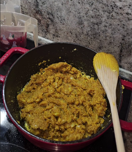Die Sauce sollte cremig und leicht dickflüssig sein, aber nicht trocken werden. Falls die Sauce zu dick wird, etwas mehr Wasser dazugeben