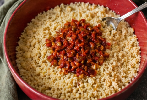 Die Zwiebel-Tomaten-Mischung zum Couscous geben und gut vermengen