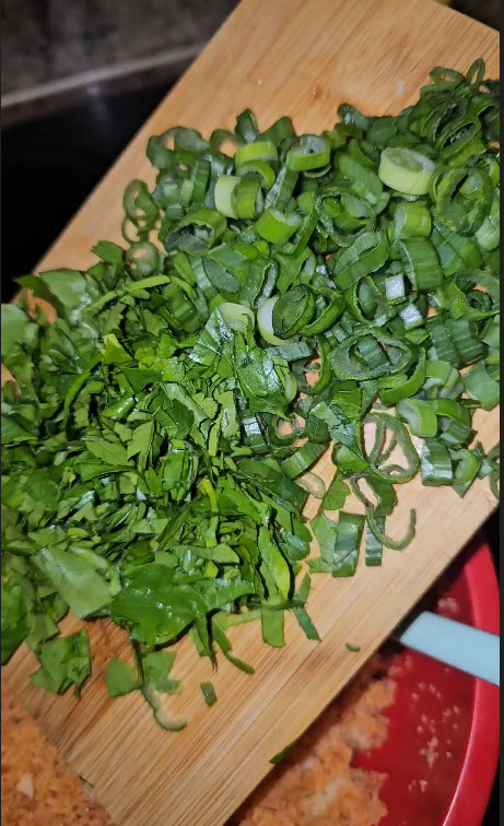 Vom weissen Teil der Frühlingszwiebeln ebenfalls fein hacken und dazugeben