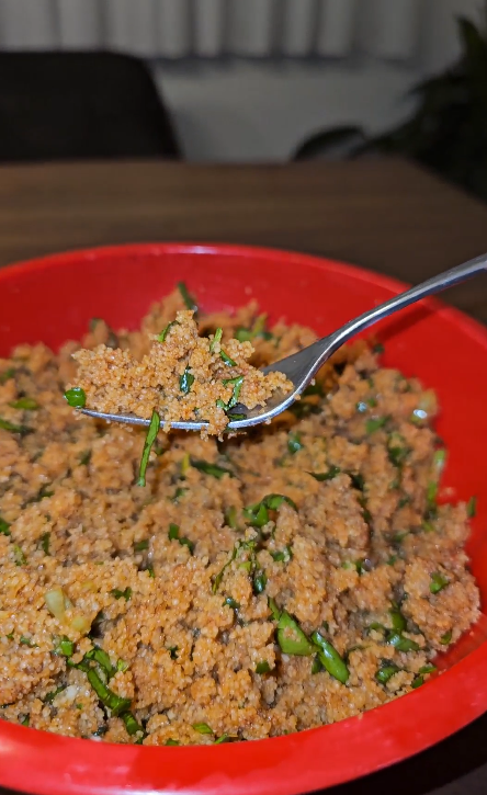 Ein aromatischer, leicht säuerlicher Bulgursalat, der durch das Anrösten der Zwiebeln eine besonders intensive Tiefe bekommt. Diese Variante kommt ohne frische Tomaten aus und überzeugt mit einer perfekten Balance aus Würze und Frische – ideal als Beilage oder leichtes Hauptgericht